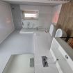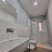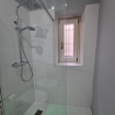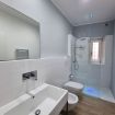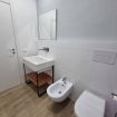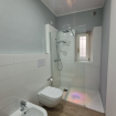 Bagno con doccia con cromoterapia,sanitari sospesi,lavabo con specchiera.